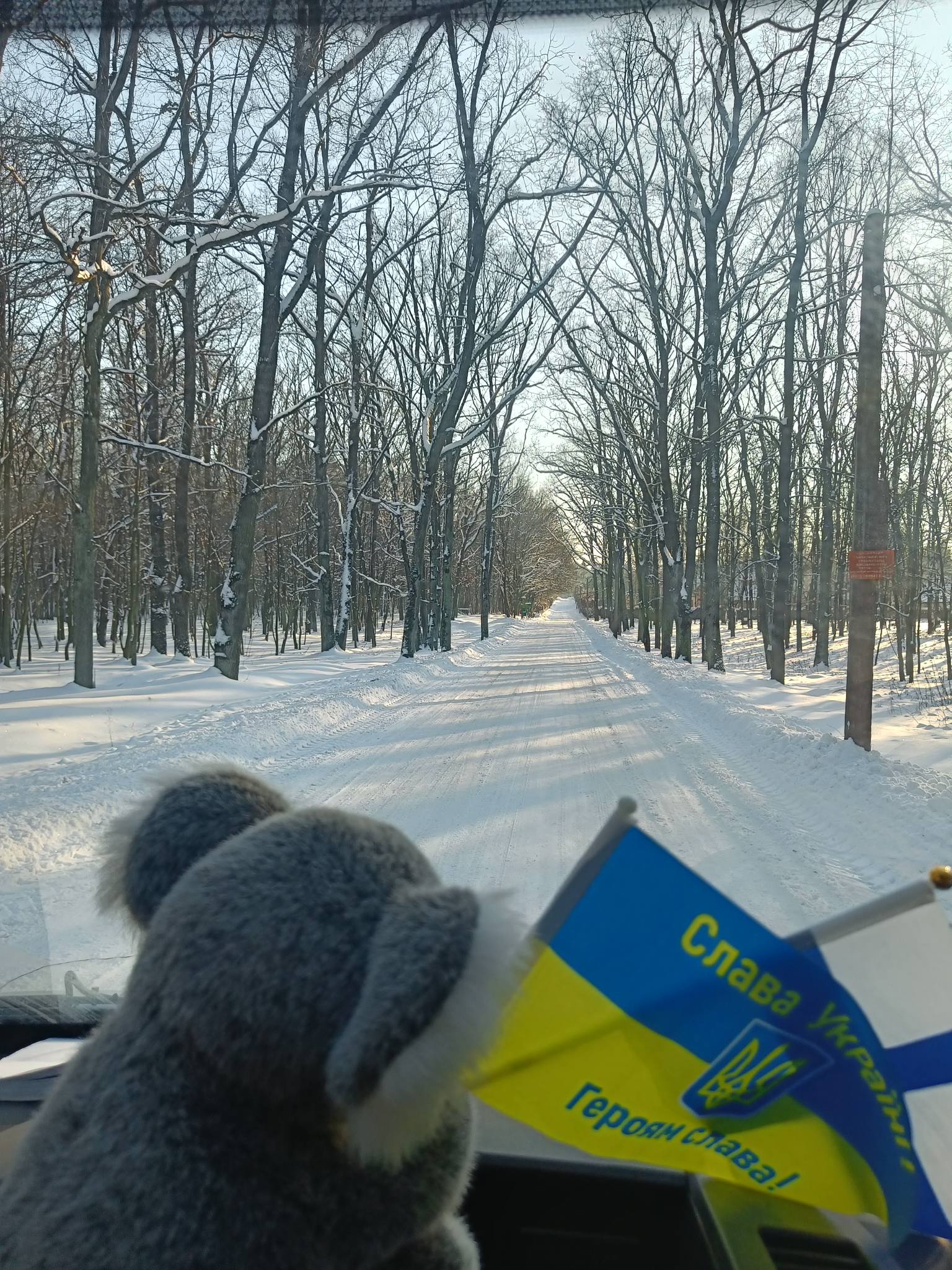 Tänään käytiin vielä aamulla viemässä Kivertsiin eläinsuojalle yksi aggregaatti, ruokaa ja lääkkeitä, sekä sairaalasänky eräälle veteraanille. Keli on aurinkoinen, pakkasta on -17 ja lunta paljon enemmän, kuin kotipihassa oli lähtiessä.
